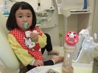 えまちゃんフッ素中☆だるまさんも応援してるよー!トレーに入れて3分噛めたね♪